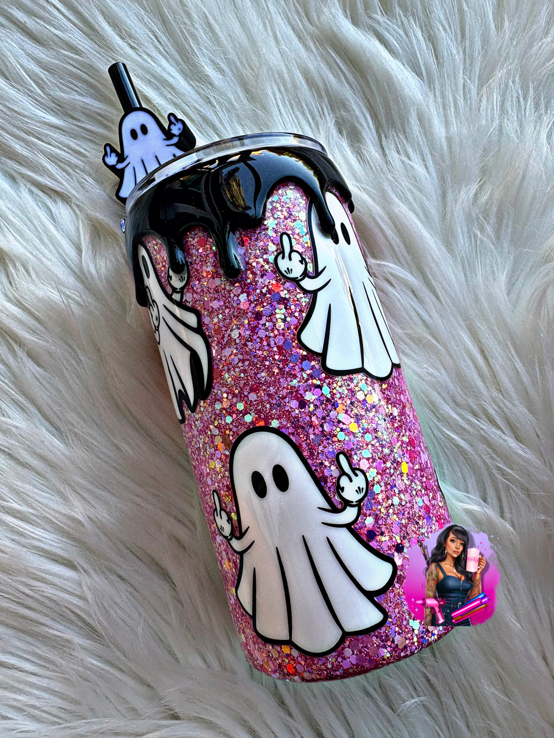 16oz stainless steel tumbler.  Fits in car cup holders Comes with straw topper and snowglobe bottom